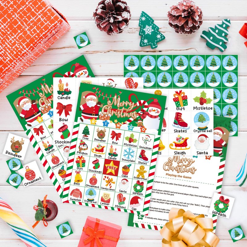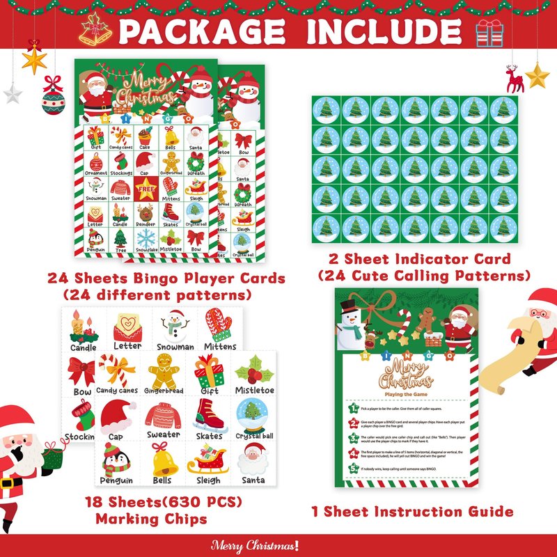 - Christmas bingo game set: You will get 24pcs unique bingo player cards, 630pcs marking chips, an easy-to-follow instruction card and 2pcs caller chips. Enjoy quality time with your family and create lasting memories