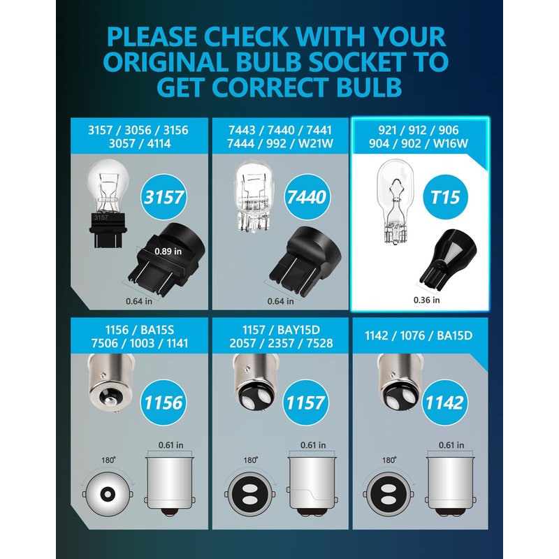- 【FITMENT】T15, 912, 921, 906, 904, 902, W16W bulbs. Usually used for backup reverse lights