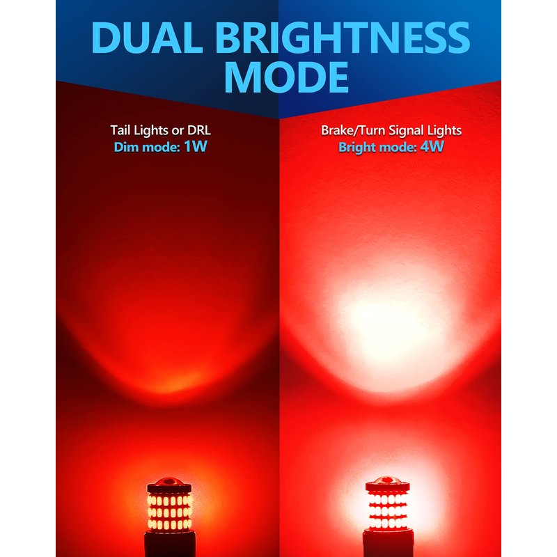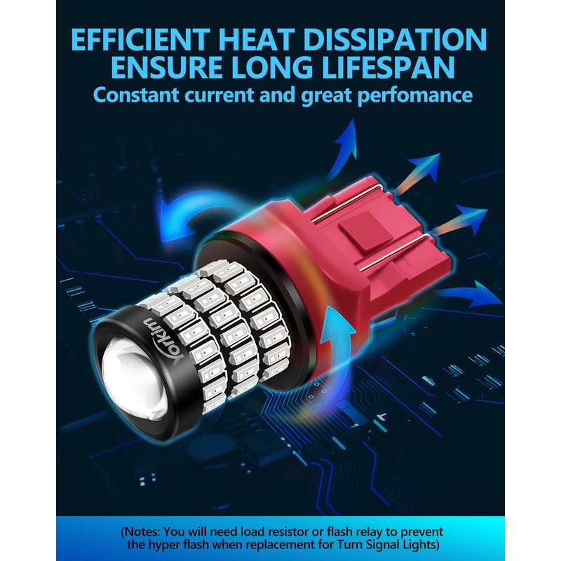 - 【ULTRA BRIGHT】 – Yorkim 7440 LED Bulbs Red comes with 2 pcs of high quality LED bulbs each designed with 54pcs 3014 & 4pcs 3030 chips radially mounted around the bulb to create a wide 360° viewing angle for better, brighter, allover light emission. 400% brighter than original halogen bulbs