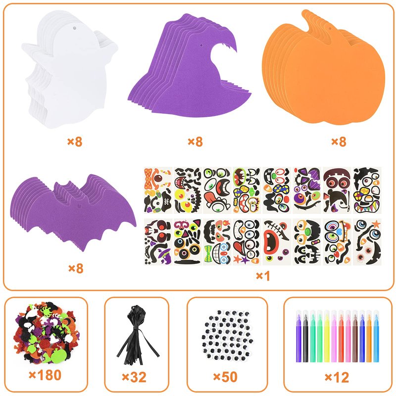 - 【Package Included】There are 180 x foam halloween stickers, 8 x halloween foam pumpkin, 8 x foam bat, 8 x foam ghost, 8 x foam witch hat, 50 x wiggle googly eyes, 16 x cute face stickers, 12 x colorful pens and 32 x black cords.