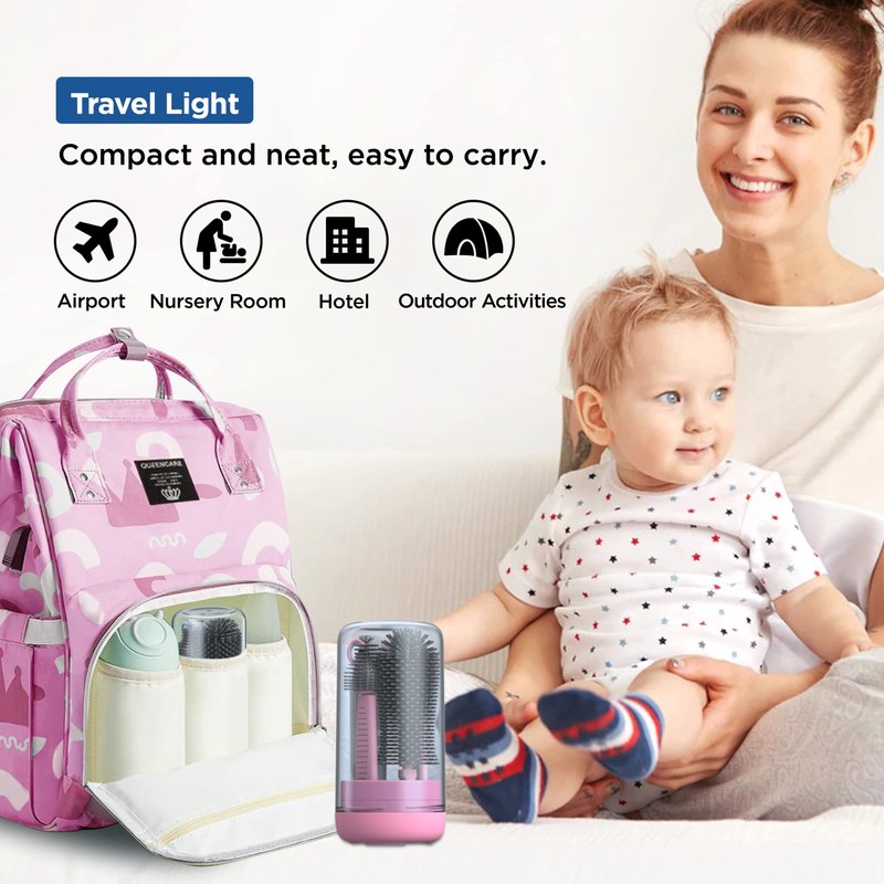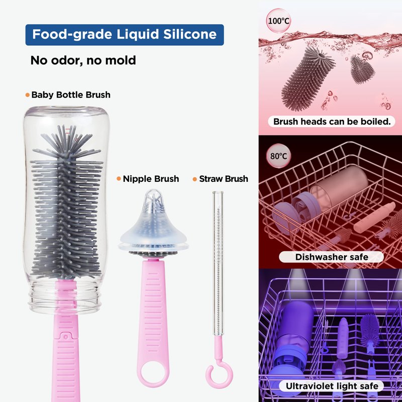 - ✈【BPA Free Material】This baby bottle cleaner set is made without BPA. It is made of odorless high quality food-grade silicone and ABS which are safe and environmental. The whole set is dishwasher safe. The brush heads are suitable for boiling. But the brush wands are not suitable for boiling. This travel bottle cleaning kit is ideal for cleaning and drying bottles on the go. A sweet and considerate gift for pregnant women and new moms.