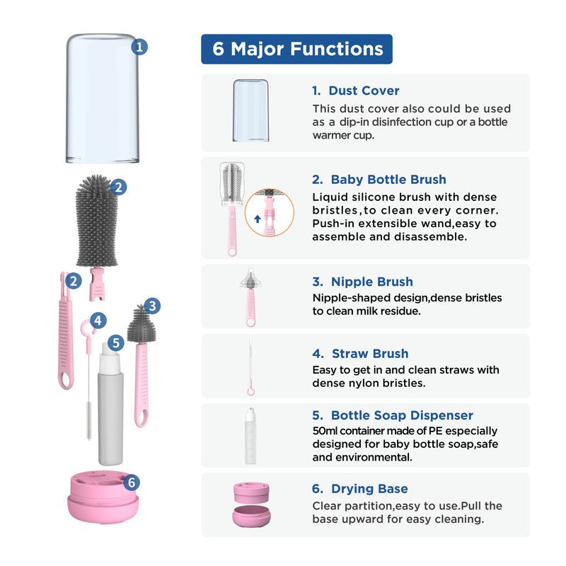 - ✈【YOTIME Portable Bottle Cleaning Kit】Travel bottle cleaner kit has a 6 in 1 design which features baby bottle brush with an extendable wand, nipple brush, straw brush, dust cover, 1.7oz baby bottle soap dispenser and stand. This silicone brush set is more hygienic than easy-to-mold and hard-to-dry sponge brushes, durable silicone bristles are scratch-free yet soft.