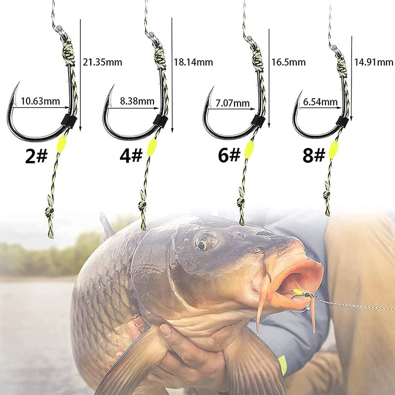 - EXCELLENT CARP HOOK: Made of high carbon steel.Hair rigs complete with sharp carp curved shank barb hooks, the sharp hooks usually grip safely in the lip of the fish. This makes it difficult for the fish to spit the hook.