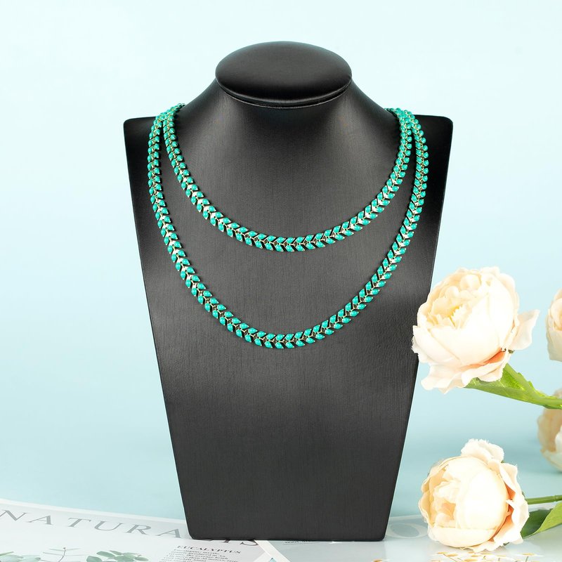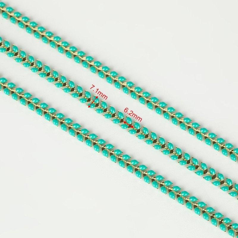 - Chain Link Size: The size of this bluish green arrow chain link size is about 7.3mm long, 6.1mm wide and 2.2mm thick. The lobster clasps length is 10mm, the diameter of the jump rings is 4mm. Proper chain link size makes the chain necklace can be worn alone or matched with most sized charms pendants.
