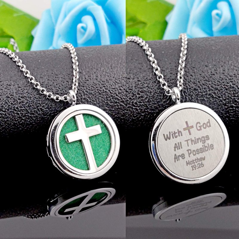 - ❤MATERIALS❤: Essential oil diffuser cross necklace pendant,with 316L stainless steel 24inch chain and 49 refill pads (12 color),the back said: "With God All Things Are Possible",Stainless Steel,highly resisted to rust, corrosion and tarnishing, Sturdy and Durable.