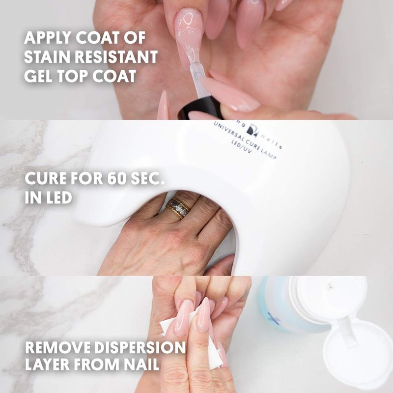 - Easy Application & Quick Curing - Our Stain Resistant gel top coat cures in 60 seconds under both UV and LED lights. Once cured, simply remove the dispersion layer from your nail with our Nail Swipe.