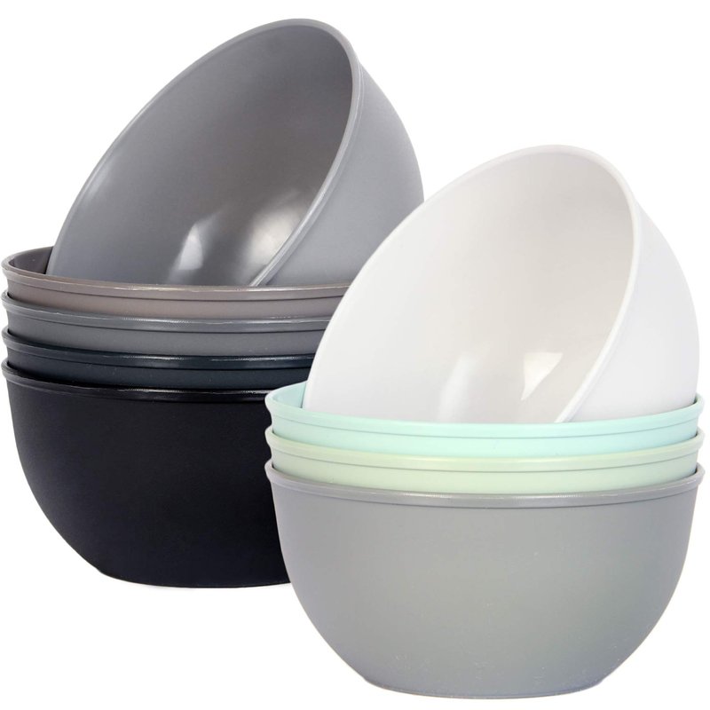 - Plastic Small Bowl: 9 Pack 10 oz plastic bowls in 9 urban colors.