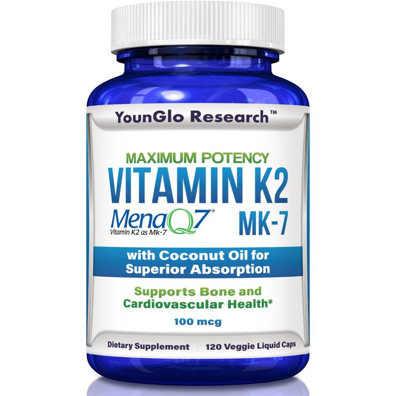 YounGlo Research Vitamin K2 MK7 (MenaQ7) 100 mcg w/Coconut Oil for Superior Absorption, Dietary Health Supplement, 120 Vegan Liquid Capsules to Support Bone Strength & Density for Adults Women & Men