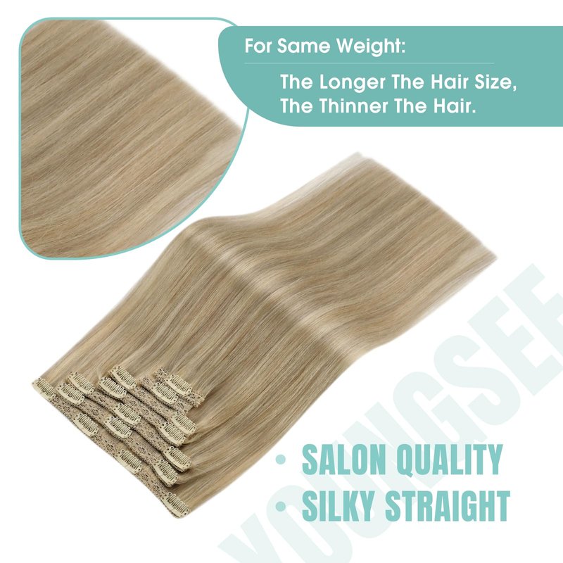 - 【Details】YoungSee Clip on Hair Extensions Blonde Highlight- are made of real human hair. Soft silky straight clip in human hair extensions, blend well with your own Hair, natural and glossy, no tangle. Double weft covered by lace, more breathable and comfortable.