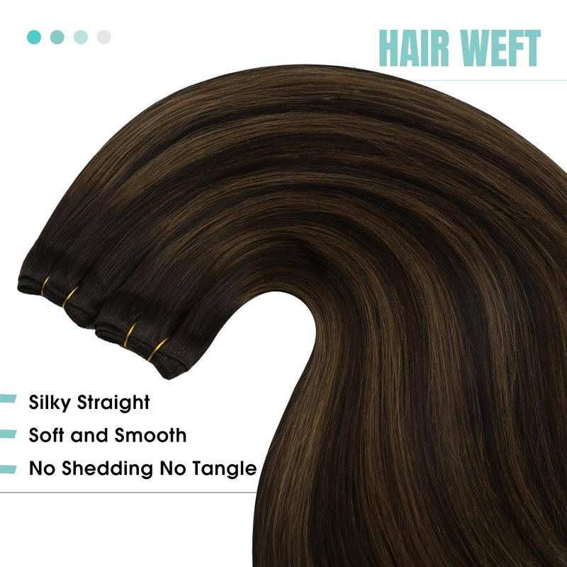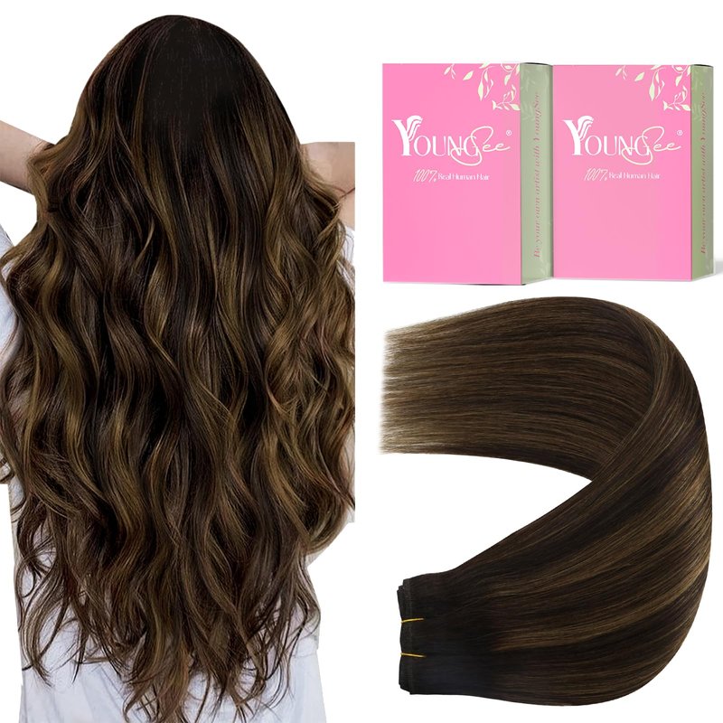 YoungSee Sew in Hair Extensions Brown Weft Hair Extensions Human Hair Dark Brown Mix Medium Brown Highlights Human Hair Weft Extensions Sew in Real Hair Extensions No Tangle 100G 22In