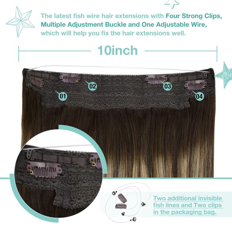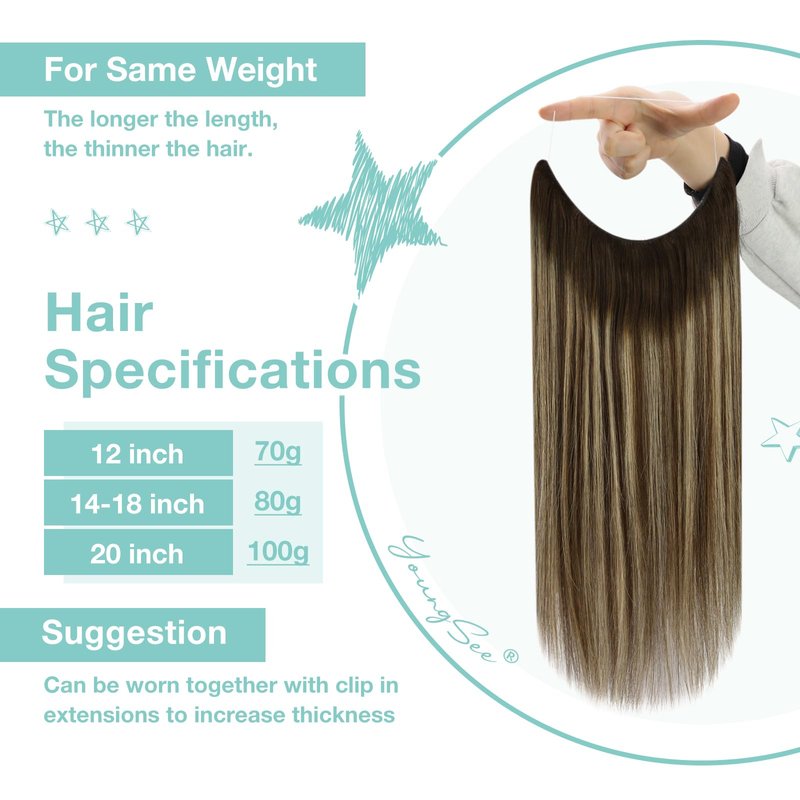 - 【Personalized Customization】 YoungSee fishing line hair extensions brown balayage are tailored for you! Our wire human hair extensions can be customized based on individual head shape, hair volume and hair color, to ensure better fit and naturalness. If you find the wire to be too long, we can customize it for you based on your head circumference! Whether it's for special occasions or daily looks, our customized wire extensions will make you look more elegant and confident.