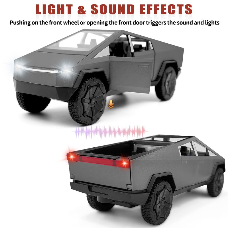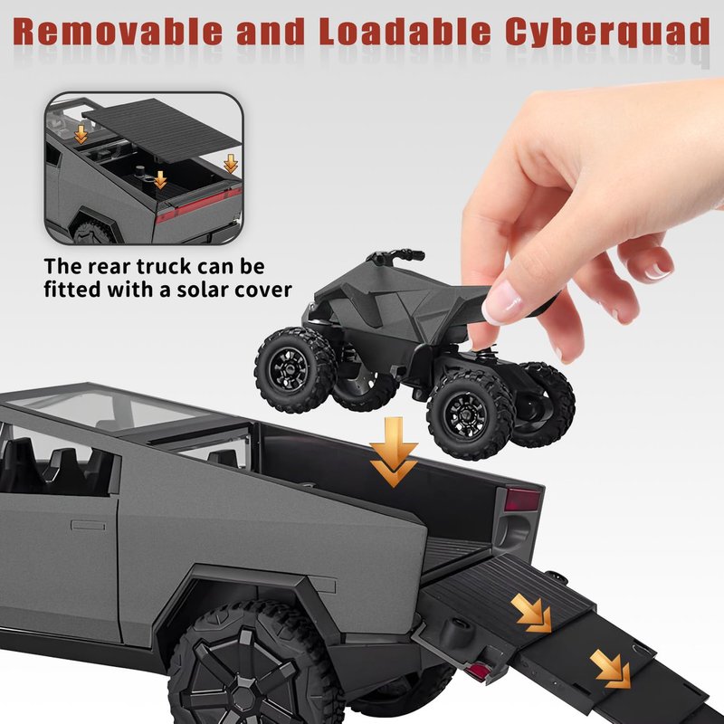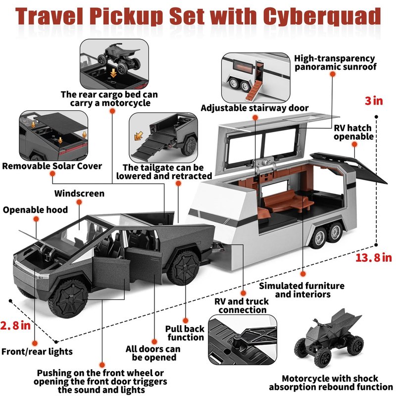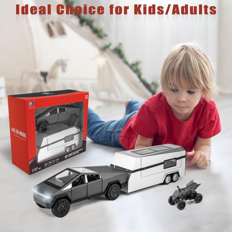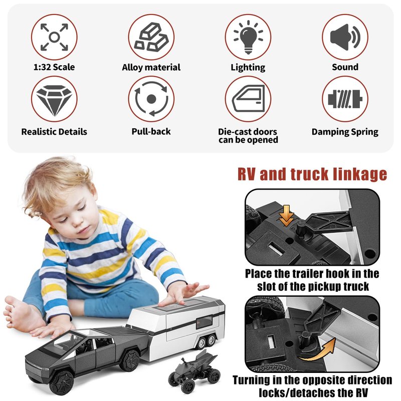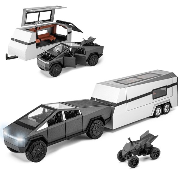 Youngyes Cybertruck Toy for Kids, Pickup Truck with RV Motorcycle Cybertquad Metal Die-cast Model Car, 1/32 Toy Truck and Trailer with Sound/Light/Pull Back, Ideal Gift for Boys Aged 6 and Up (Grey)