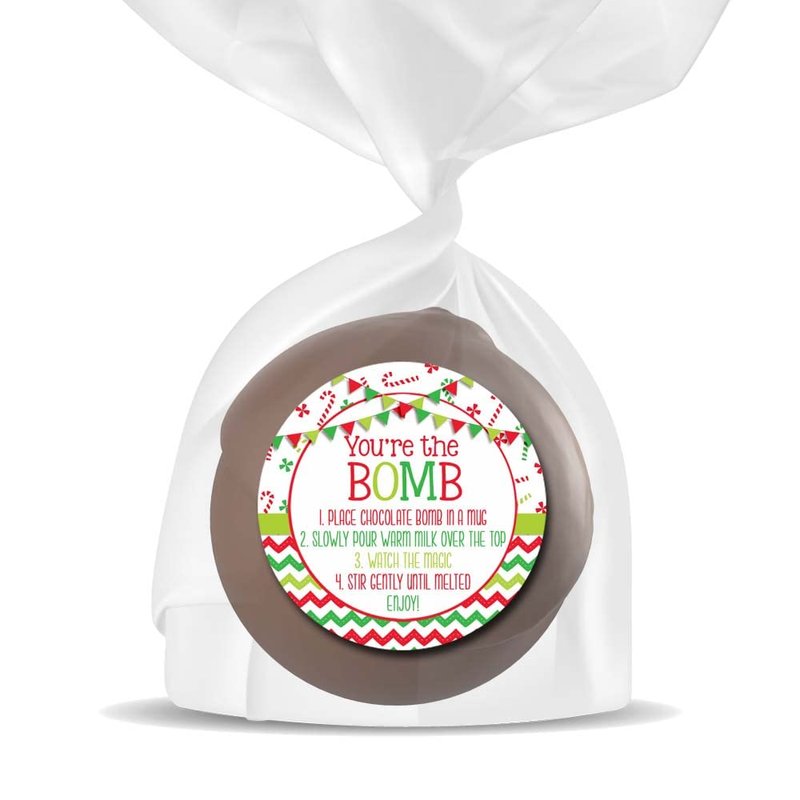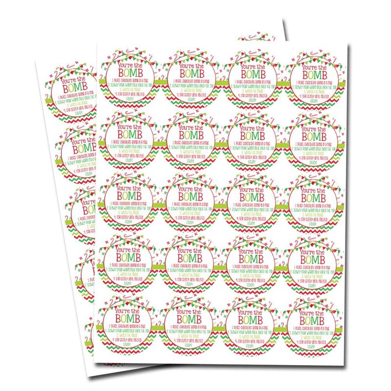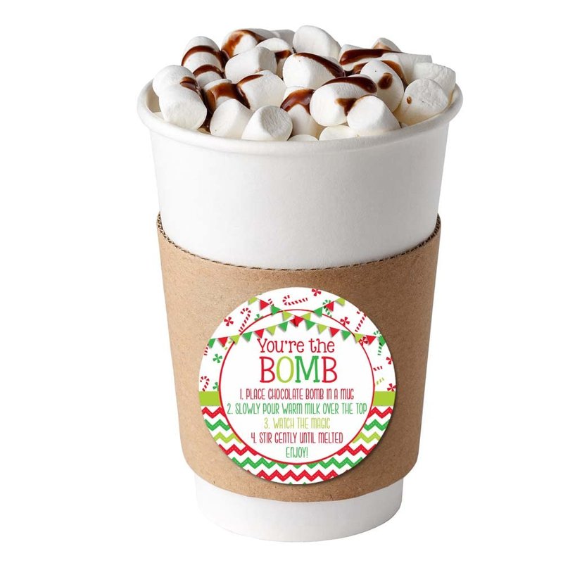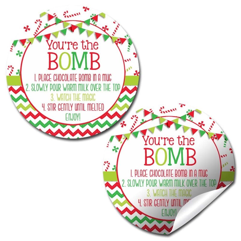 - Cocoa Bomb Overload: Hot cocoa bombs are all the rage this year! Giving some out as gifts and want your packaging to stand out? Designed by a talented mom, these festive stickers feature a fun Christmas design, plus all the detailed cocoa bomb instructions to fit perfectly on a package. These are great for making your hot chocolate bomb gift packs extra special for your friends & loved ones! Amanda Creation. Original design by Amanda Creation.