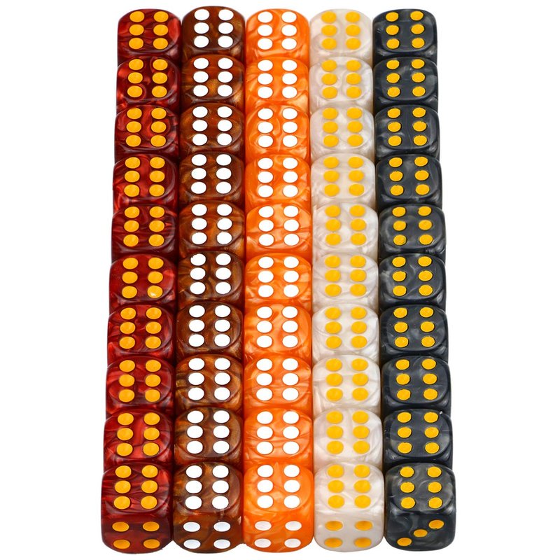 - Package - 50 pieces of standard 6-sided dice in 5 Pearl colors, with 10 pieces for each color.