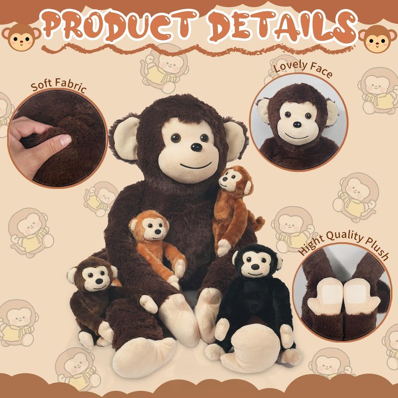 - 5-In-1 Monkey Plush Animal: Youthfuljive's monkey stuffed animal toys contain 1 mommy monkey and 4 cute monkey babies plushie. The monkey stuffed animal toys can provide fun and a bit of learning for children. The soft monkey body just invites hugging, making her an attractive toy for children of all ages.
