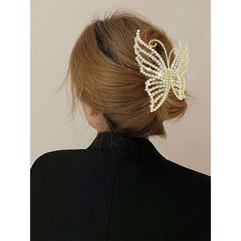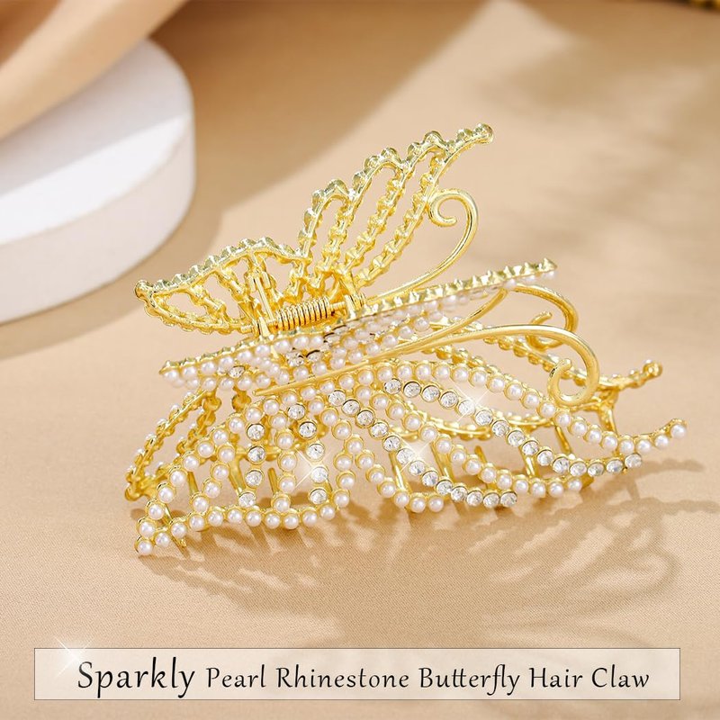 Yovic Fashion Rhinestone Butterfly Hair Clips Gold Bling Pearl Hair Claw Clip Sparkly Butterflies Hair Jaw Clips 1Pcs Hair Accessories for Women and Girls (Pearl Rhinestone Butterfly Clip)