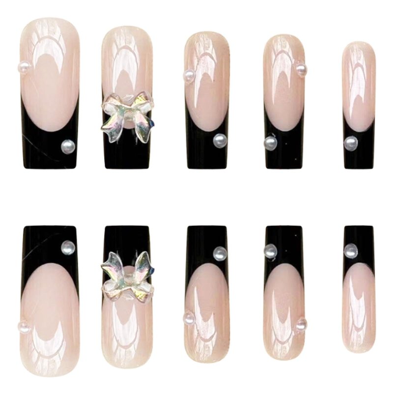 YoYoee Black French Nails Tips Ballerina False Nails Long Square Press on Nails Full Cover Acrylic Pearl Bow Fake Nails for Women and Girls 24PCS