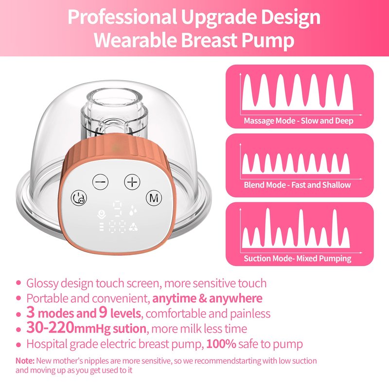 - 【Upgraded Experience】Our electric breast pump upgraded 3 modes(massage , expression, and mixed mode) that naturally mimic the baby's feeding, and 9 levels provide more options that help make the wearable breast pump more comfortable to use.
