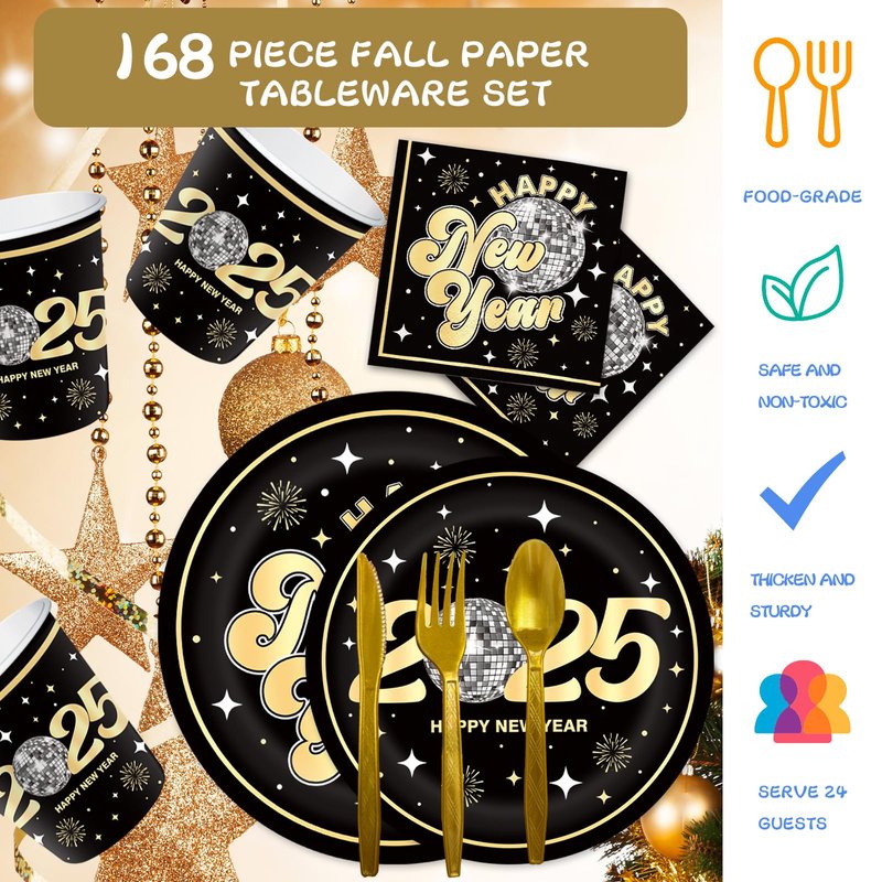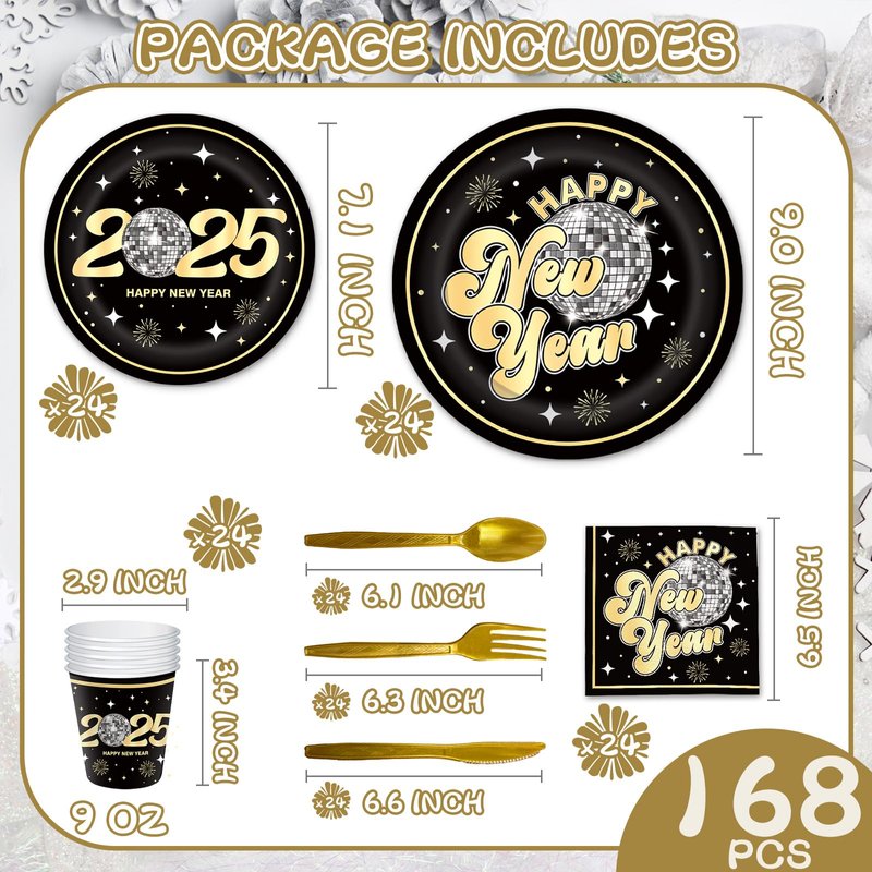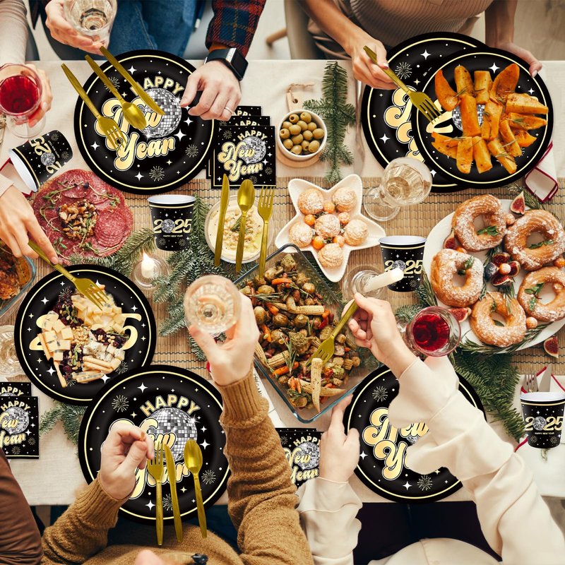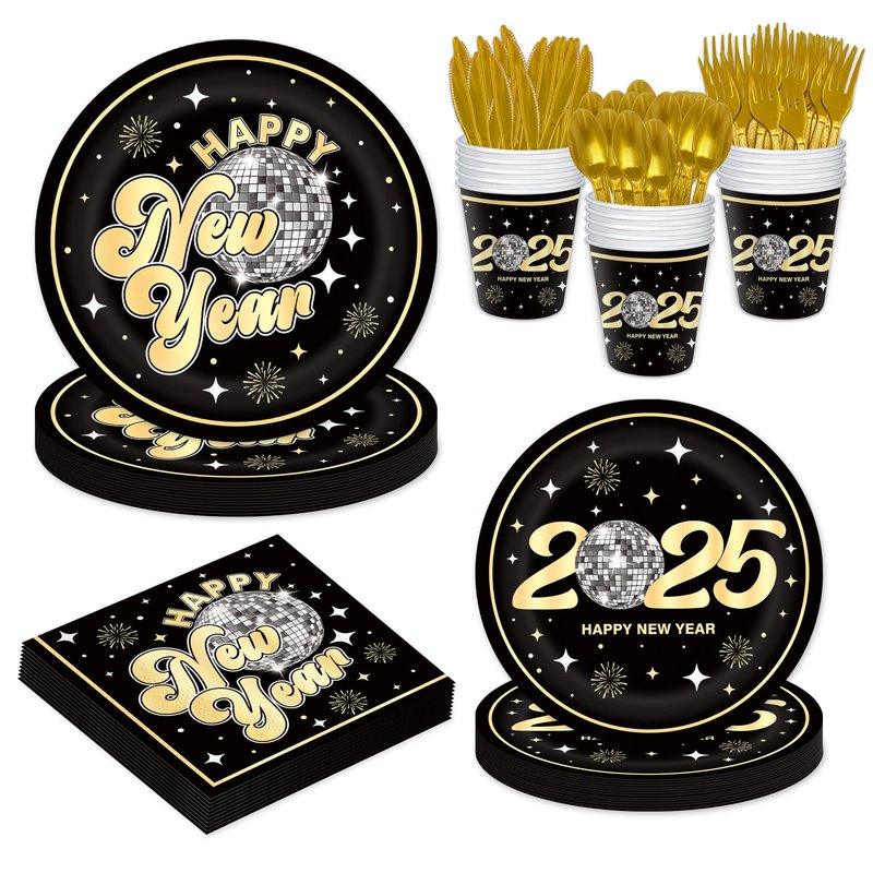 - COMPLETE DISPOSABLE NEW YEAR TABLEWARE SET FOR 24 GUESTS: This YQUQWN New Year Disco Tableware Set is designed to serve 24 guests. It includes 24 9-inch "Happy New Year" dinner plates, 24 7-inch "2025" dessert plates, 24 New Year-themed napkins, 24 forks, 24 spoons, 24 knives, and 24 cups. Perfect for any New Year's or New Year's Eve celebration, this set ensures you have ample supplies for everyone at your party