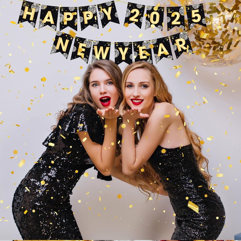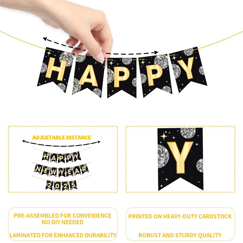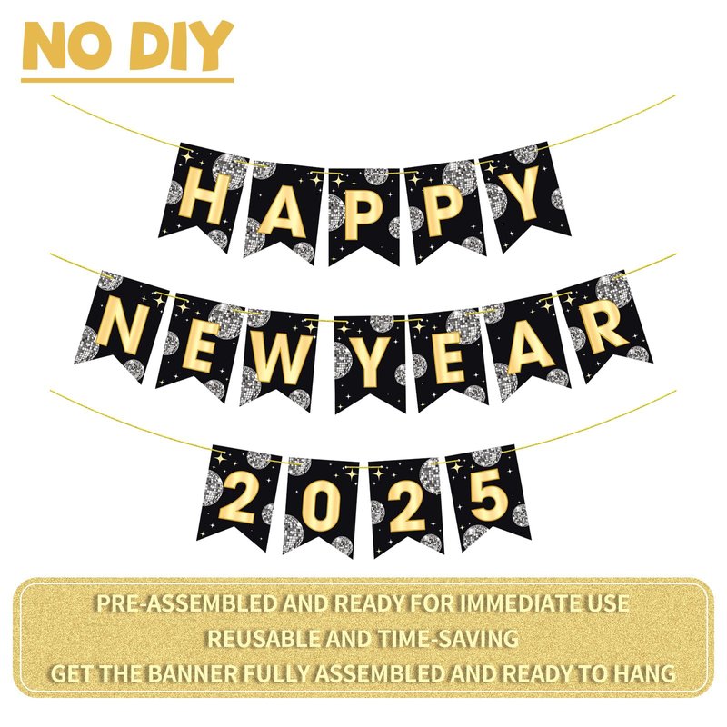 - CLASSIC AND ELEGANT BLACK AND GOLD TONE: Elevate your New Year's Eve party with this classic "Happy New Year" banner. The sophisticated black and gold color scheme, complemented by silver disco balls, adds a touch of refinement, creating a stylish and festive atmosphere. Whether hung in any room, this banner perfectly blends with your 2025 New Year decorations, making your celebration unique and memorable