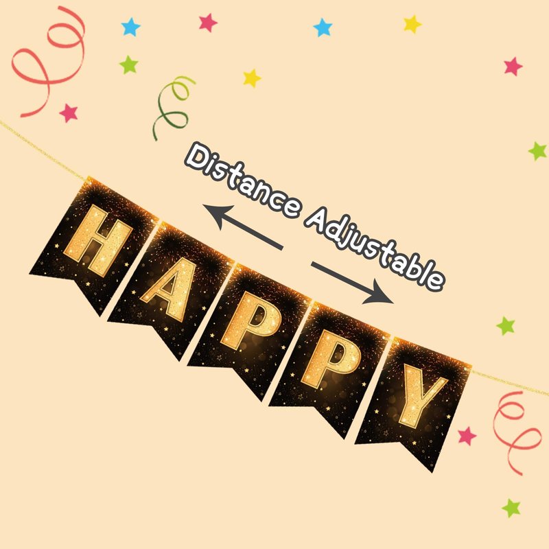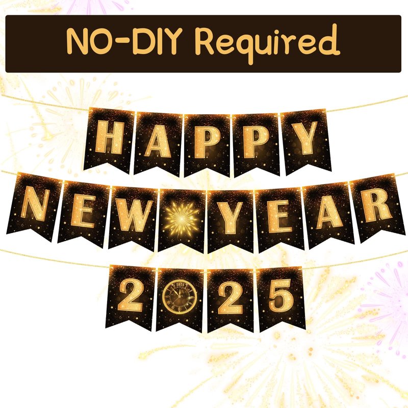 - Pre-Strung: Save time and effort with our Happy New Year Banner 2025 - it's all pre-strung on a 10ft long rope. No DIY required! Simply hang it up, and you're ready to go. This gold Happy New Year banner comes pre-assembled with an adjustable feature, allowing you to customize the spacing of the New Year banner cards to your liking.