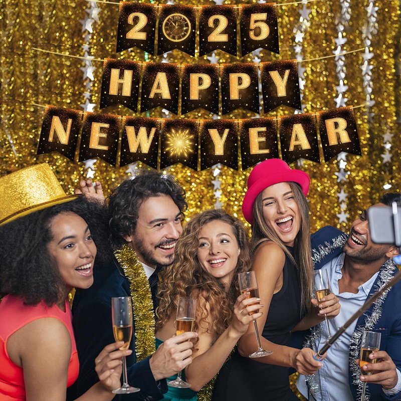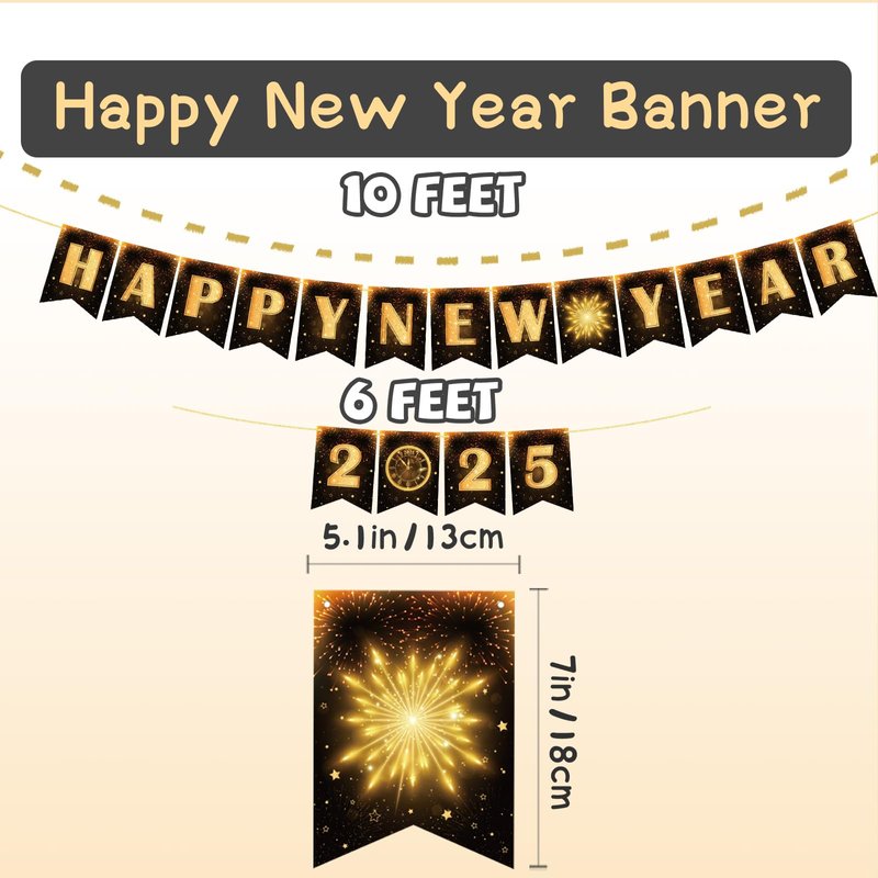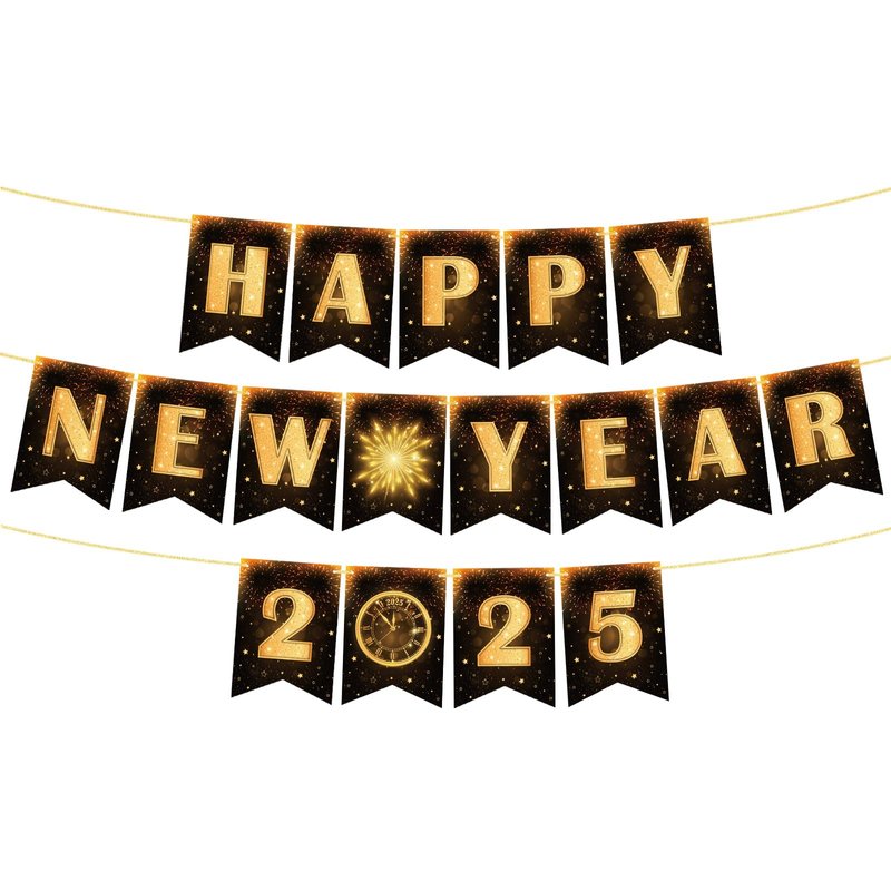 - NYE Decorations: Are you busy preparing and setting up your party event to welcome 2025? Look no further; this luxurious-looking Happy New Year 2025 banner is perfect for your New Year's decorations at home. It will help make your Happy New Year decorations for 2025 both memorable and fun. These black and gold printed New Year's Eve decorations are a perfect match for your New Year's party decorations. Get ready to ring in the new year in style!
