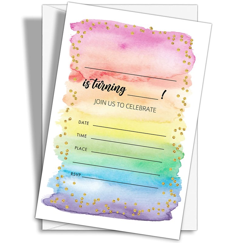 YQV Colorful Rainbow Birthday Party Invitations, 20-Count Watercolor Rainbow Glitter Birthday Party Invites With Envelopes-HBYQK-B59