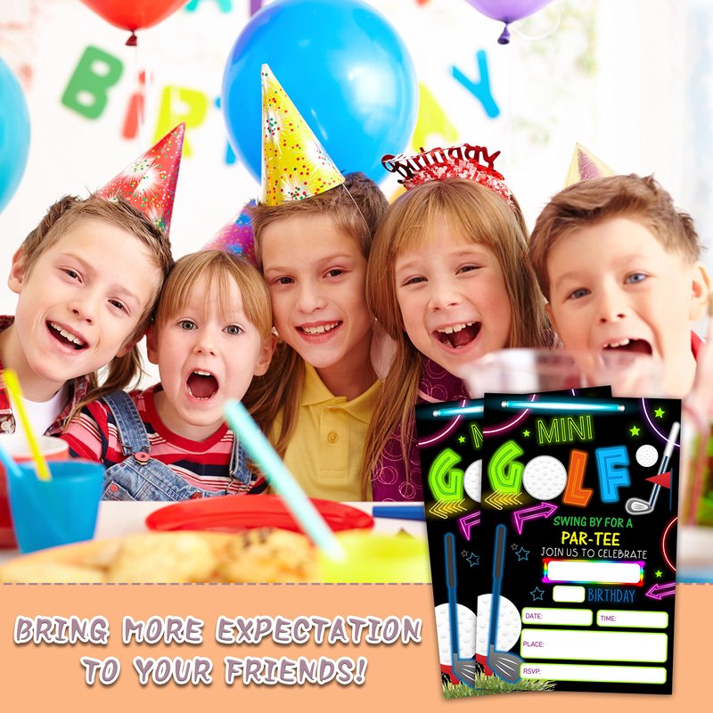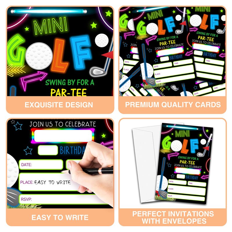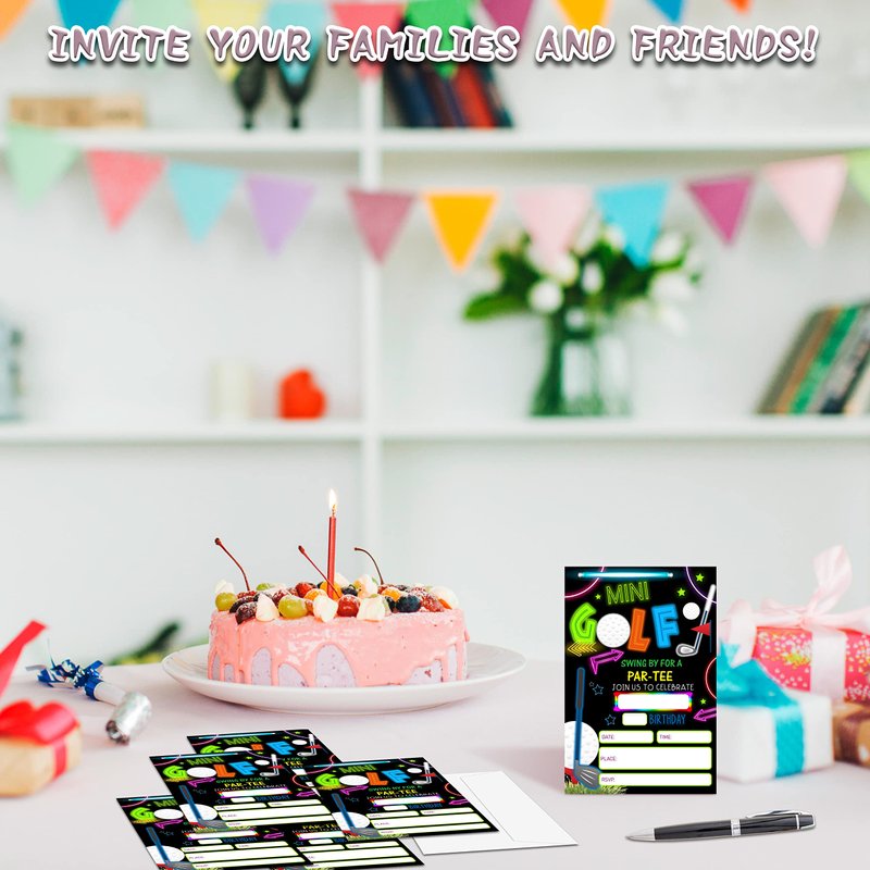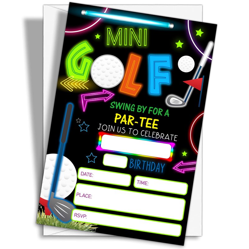 YQV Mini Golf Invitation Birthday Party Invitations, 20-Count Neon Glow Gloss Arcade Laser Sport Theme Birthday Party Invites With Envelopes-HBYQK-B01