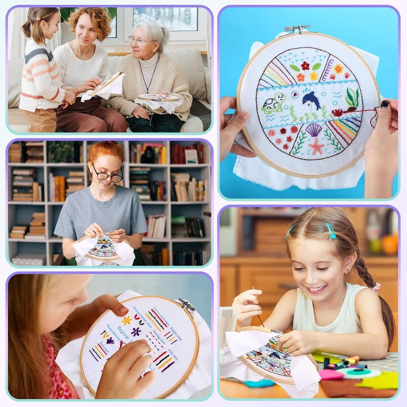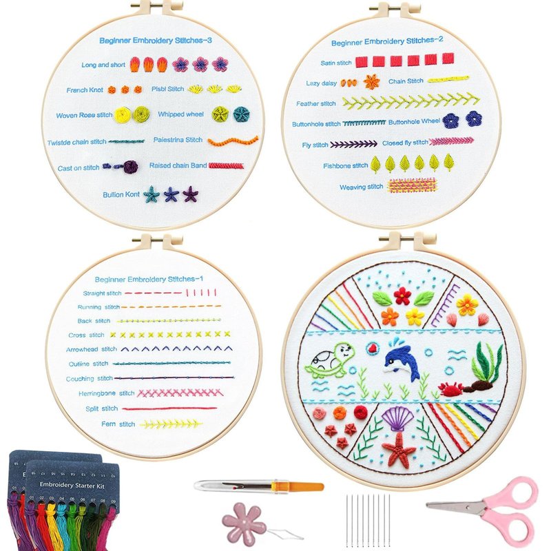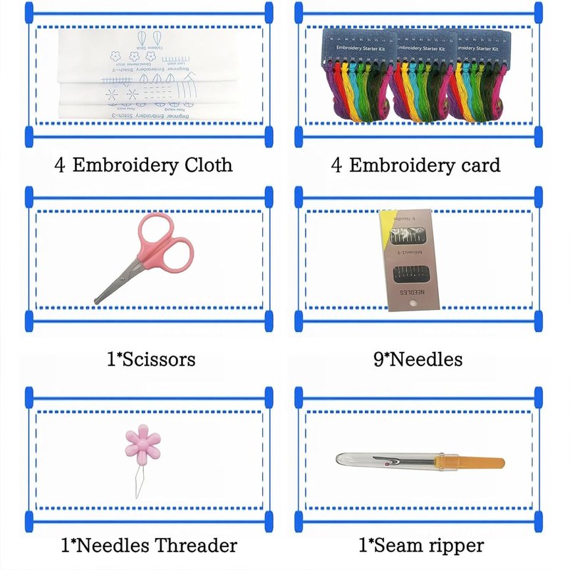- 【Package Includes】:Beginners Embroidery Stitch Practice Kit Includes 4 Embroidery Cloth + 4*Sufficient color line + 1*Scissors + 9*Needles + 1*Needles Threader + 1*Seam ripper + 4*Manual + 1*Bamboo Embroidery Hoop, You can start to enjoy embroidery fun just with this set.