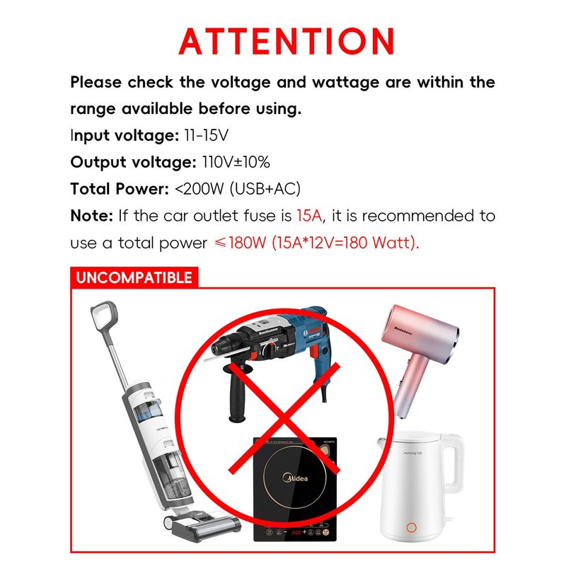 Car Charger-Car power inverter-modified sine wave Compact and lightweight, more portable than solar generator, suitable for car traveling, camping, car office, etc. car charger adapter with 110v ac sockets, two 2.4A USB, USB-C(20W),USB-QC(18W), which can meet the charging needs of a family. Applicable: cell phones, ipads, laptops, electric shavers, air cushion pumps, TVs, small fans, drones, small refrigerators and other appliances with a power of less than 200W Not applicable: curling irons, household vacuum cleaners, microwave ovens, coffee makers, cutting machines and other electrical appliances with a power greater than 200W Note: The fuse of car socket is usually 12A, so the maximum power it can withstand is 12A*15V=180W, it is recommended to use the power less than 180W. The inverter supports 12V output voltage for Rv, Truck , Camper, Trailer, and does not support 24V.