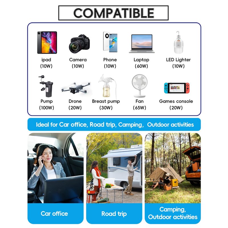 - 【Portable and Fast】 The car charger adapter is only the size of a mobile phone (5x2.7x1.4 inches, 8.5 oz+), equipped with USB-QC (18W), USB-C (20W), 110V AC Outlet, which can quickly charge electronics, making travel, camping and work more convenient.