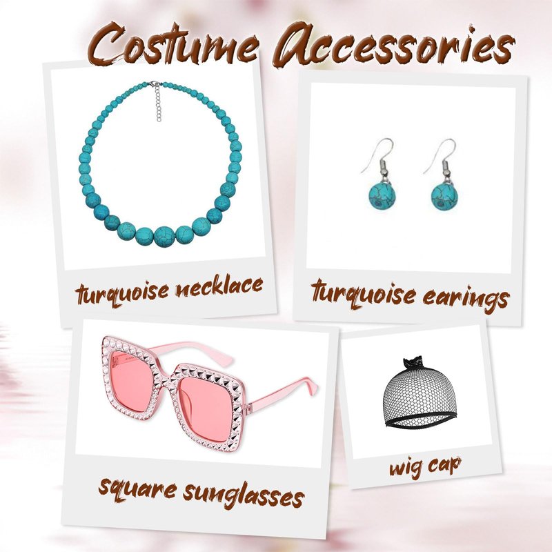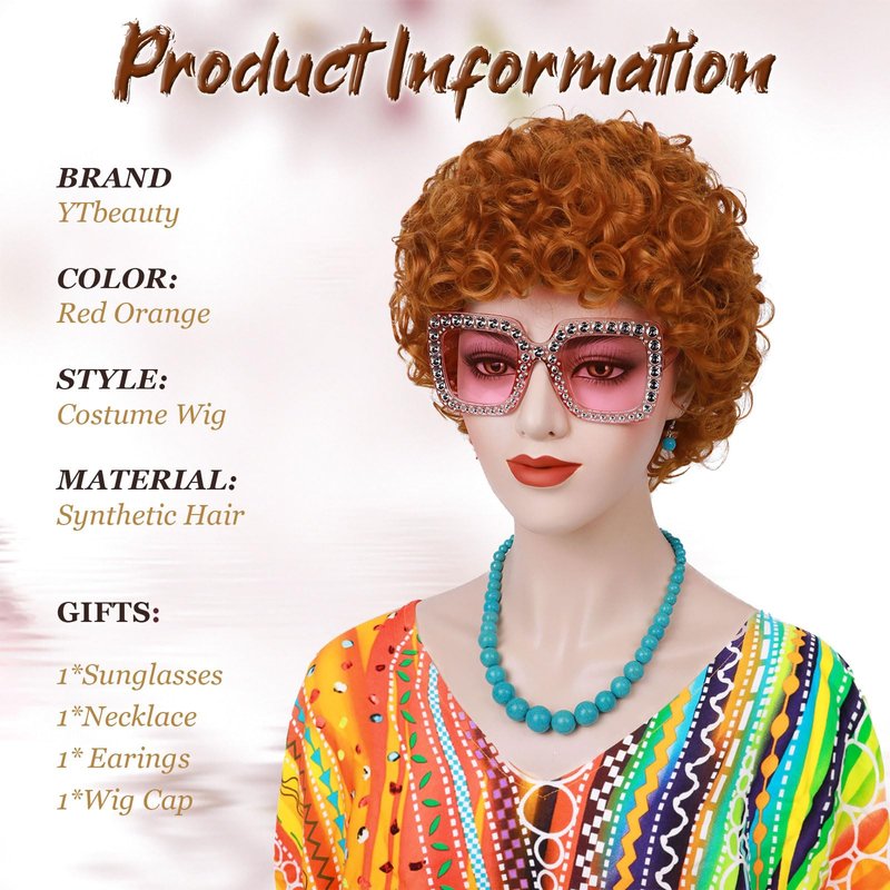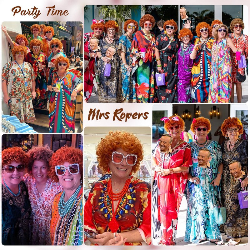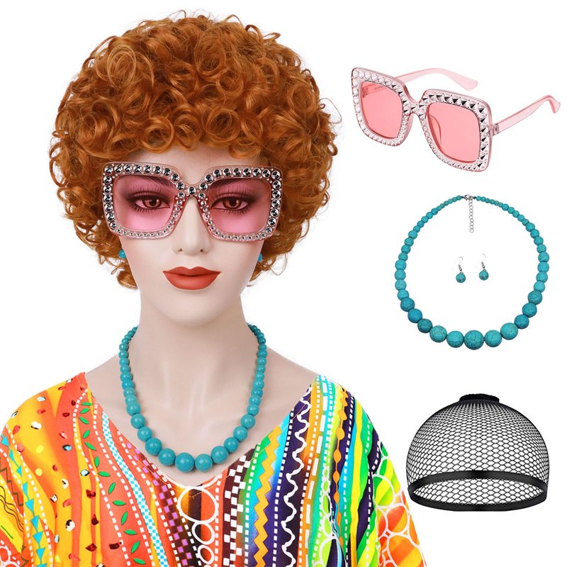 - 【Mrs. Roper Perfection】 1pc Orange Curly Wig + 1pc Retro Sunglasses + 1 pair of Hopp Earring + 1pc Blue Pearl Necklace + 1pc Wig Cap. You really only need to wear Mrs. Roper's Romps and you will get a perfect costume.