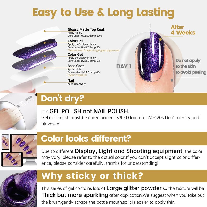 - ➍【IMPORTANT TIPS FOR USE】Gel Nail Polish must be cured and dried under UV/LED lamp, it needs to be used with Gel Base Coat and Top Coat, the curing time of each step is 60-120s, please clean the nail surface before use, keep it dry and clean.In rare cases, gel nail polish may cause an allergic reaction due to skin contact, please test it before use.