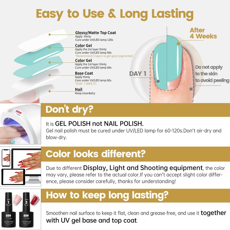 - Curing with LED Nail Lamp: gel nail polish must be cured under LED lamps, and needs to be used in conjunction with gel polish base coat and top coat in order to be more durable, each step of the curing time is 60-120 seconds.