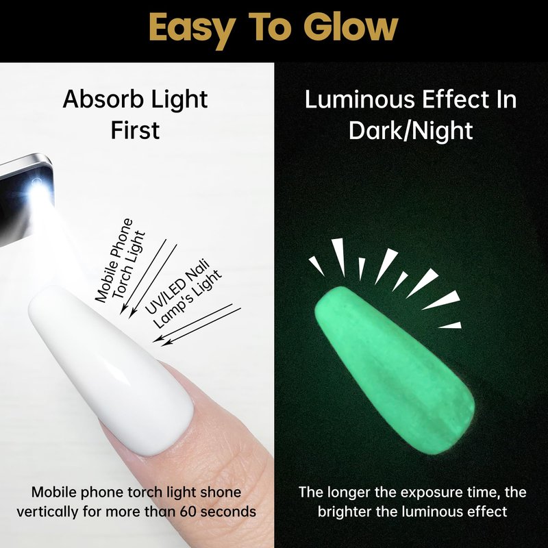 - Glow-in-the-dark Nail Gel: After light irradiation, it can glow in the dark with bright and lively colours, which can be used as ordinary solid-colour nail gel for daily life and work, and can also be used at night when attending parties, Halloween and other events to experience the fun of glow-in-the-dark nail art.