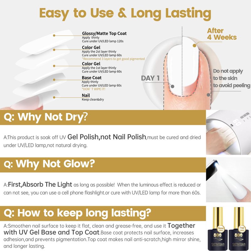 - Curing with LED Nail Lamp: Gel nail polish must be cured under LED lamps, and needs to be used in conjunction with gel polish base coat and top coat in order to be more durable, each step of the curing time is 60-120 seconds.