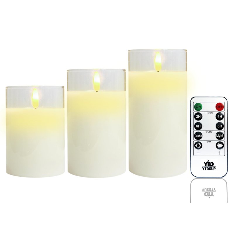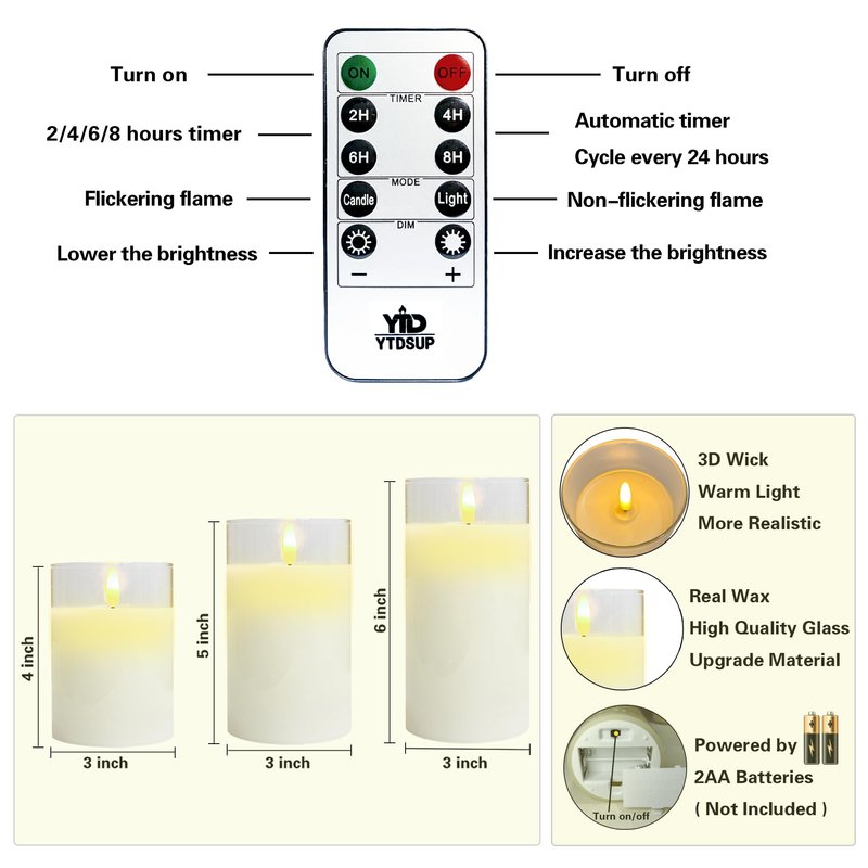 - YTDSUP Package Includes: You will get three flameless glass led candles(D 3” x H 4”, 5”, 6”), a 10-key remote control, a use manual. Operated by 2 AA batteries(not included)