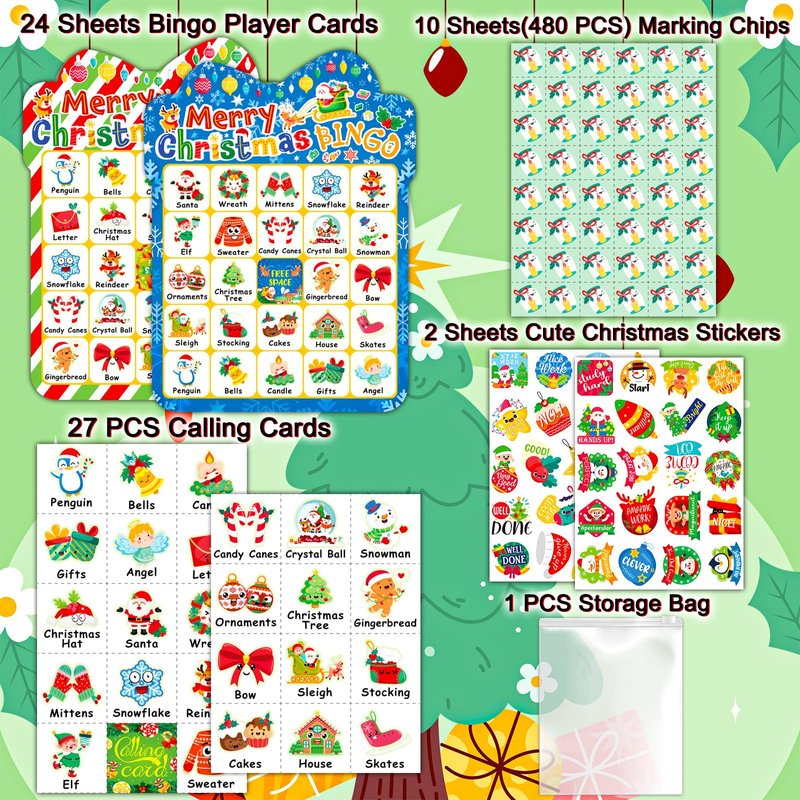 - Package include: The Christmas bingo game set include: reusable storage box and bag, 24 pcs different player Christmas bingo cards, 26 pcs well-designed calling cards, 480pcs marking cards and 40 pcs unique Christmas stickers