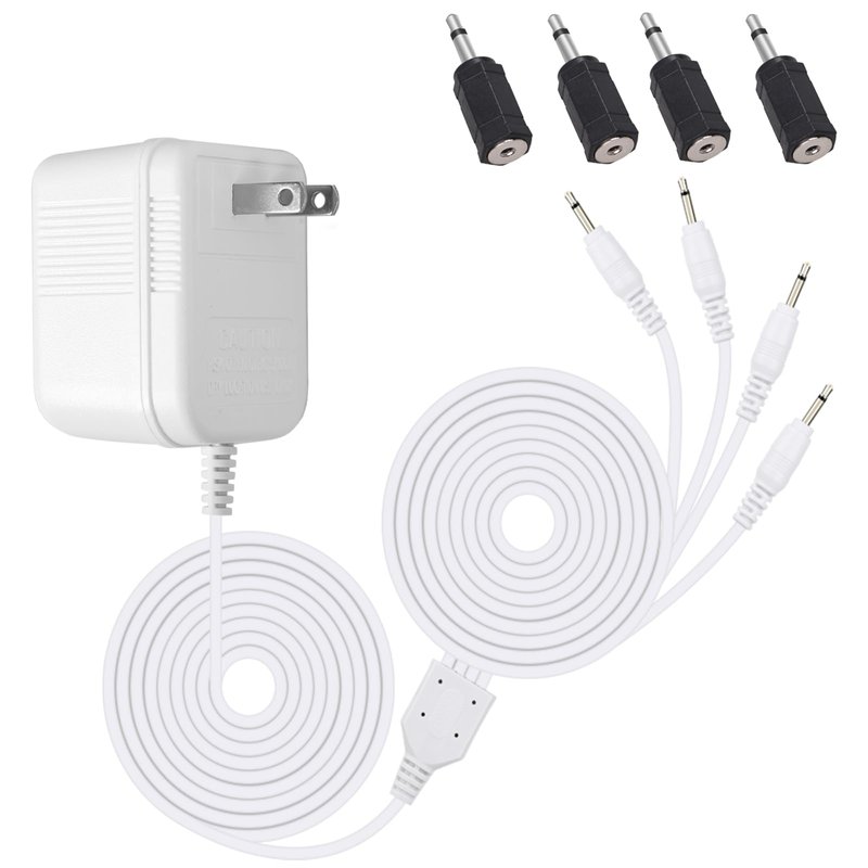 The product includes: 1 white power adapter, 4 2.5mm female to 3.5mm male converter connectors