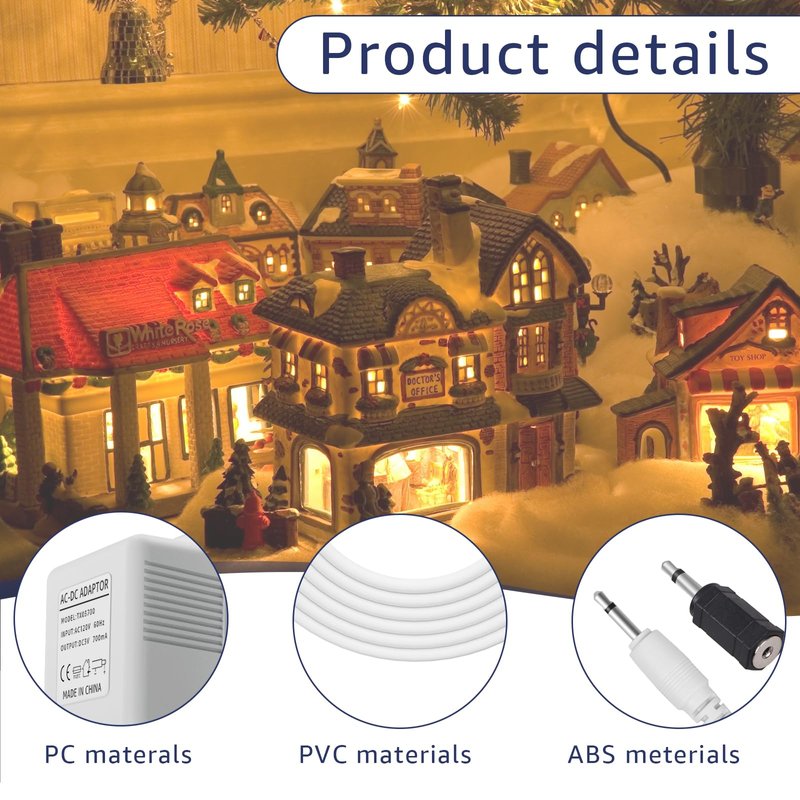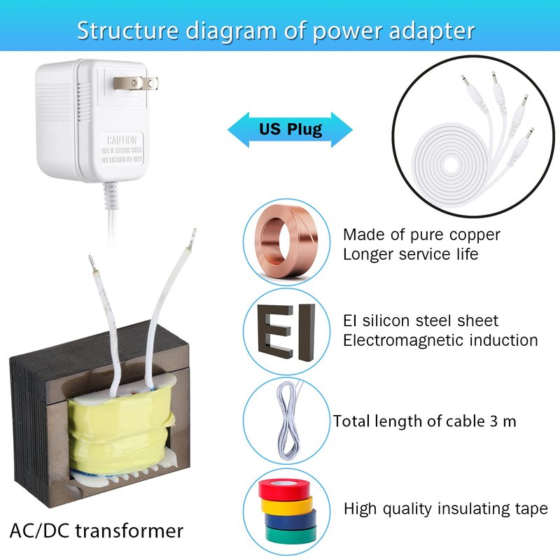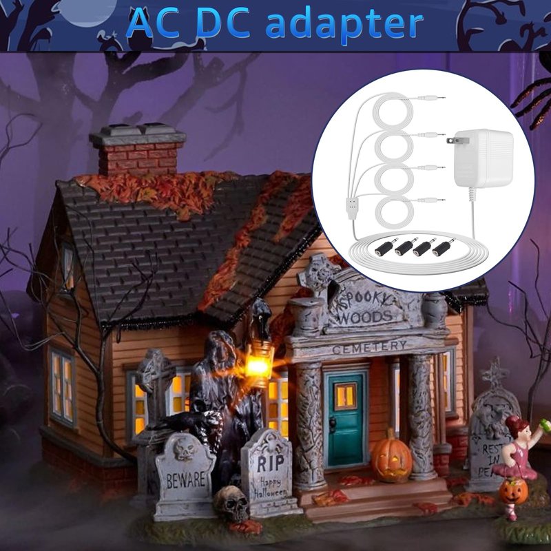 - Product specifications: Input voltage: 120V/60Hz, output 2.5-3V, rated power: 2.1W. The total length of the wire is 3M/9.84 feet, with 4 sets of output plugs, each with a branching length of 1.5 meters/4.92 feet. You can use one adapter to light up 4 devices, saving space to decorate more buildings