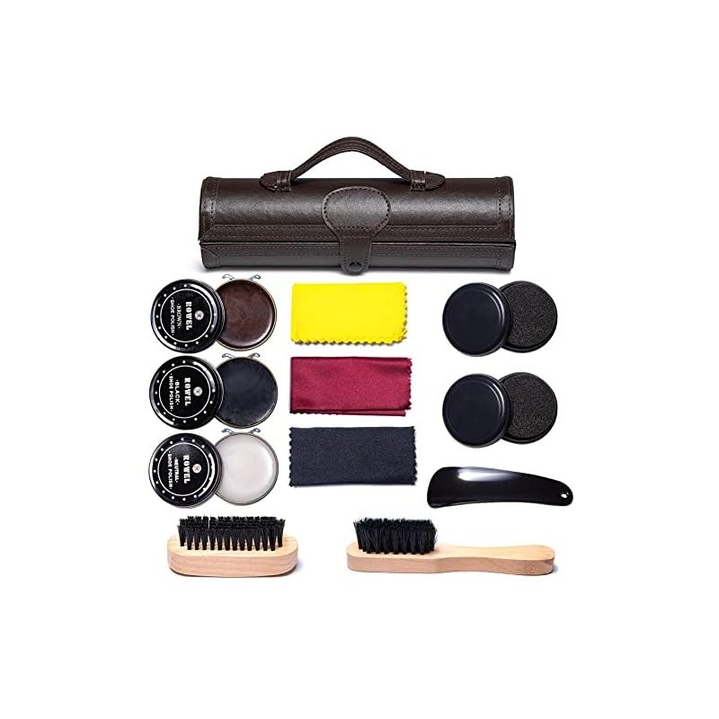 YUET Shoe Polish Kit Cleaning Shine Care Barrel Set For Brown Black Leather With Brush Travel Case Luxury Premium Soft Horsehair Bristle Dauber, Wooden Applicator, Shoehorn, Cloth 12 Piece Brown Pouch