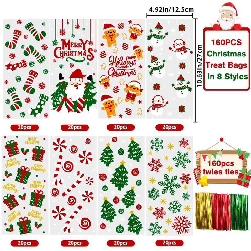 YUJUN 160 PCS Christmas Cellophane Treat Bags,Santa Claus Gift Goodie Candy Xmas Clear Cello Bags Twist Ties for Winter Christmas Theme Party Favor Supplies(8 Styles)