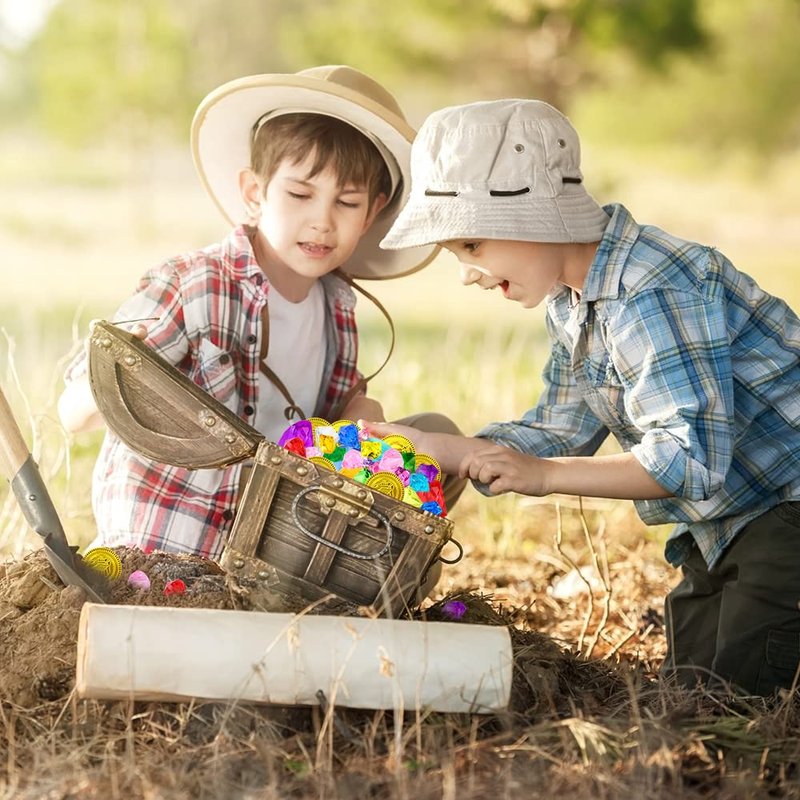 - What you will get: You will get 63 pieces pirate treasure chest set, It includes 45 pieces of diamonds, a vintage pirate treasure box, a compass, a pirate map, and 15 pieces of plastic gold coins.with vintage colors and classic design.It's a great choice for pirate treasure hunting.The children will love it.