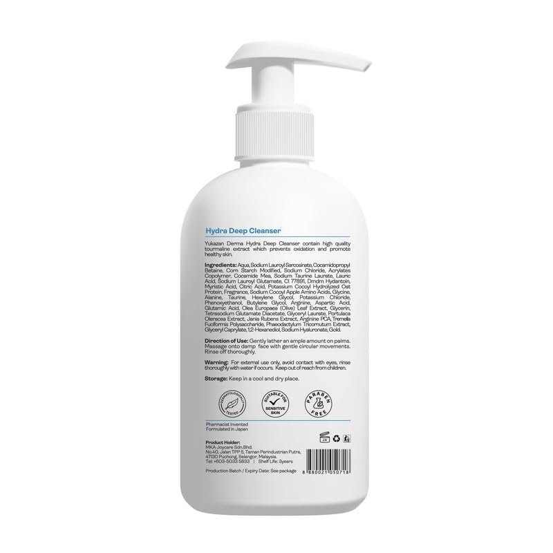 Experience the ultimate cleansing with Yukazan Derma Hydra Deep Cleanser, the perfect solution for achieving healthy, refreshed skin. Infused with high-quality tourmaline extract, our gentle formula helps prevent oxidation, promoting a radiant, youthful complexion. Our milk type cleansing lotion indulges in a luxurious cleansing experience that gently removes impurities, dirt, and makeup without stripping your skin's natural oils. The result is a perfectly cleansed and refreshed complexion that is free from irritation and dryness. Deeply nourishing and pH balanced, our cleanser has been dermatologically tested, making it safe for daily use and suitable for all skin types.