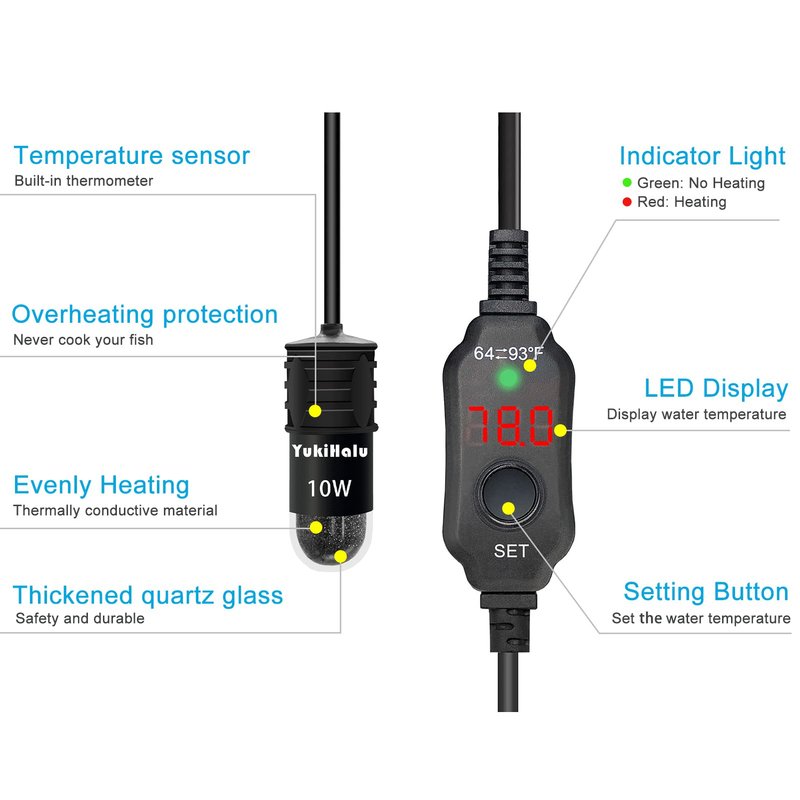 - 【Super Mini Size, 10Watt, below 1 Gallon】YukiHalu 10W aquarium heater is designed for the mini fish tanks less than 1 gallon. Compact design, take less space in the fish tank, easy to hide in the tank. Temperature can be accurately adjusted from 64 to 93°F. The rated voltage DC 5V/2A. Important tips: insufficient power of the adapter will cause no heating and the number will flash or the controller restarts repeatedly, make sure the power adapter is 5V 2A and has enough power.
