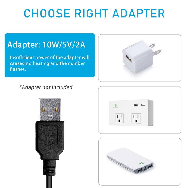 1, The device must be used under rated voltage 5V=2A(10W), insufficient power of the adapter will cause no heating. Make sure the adapter has enough power.