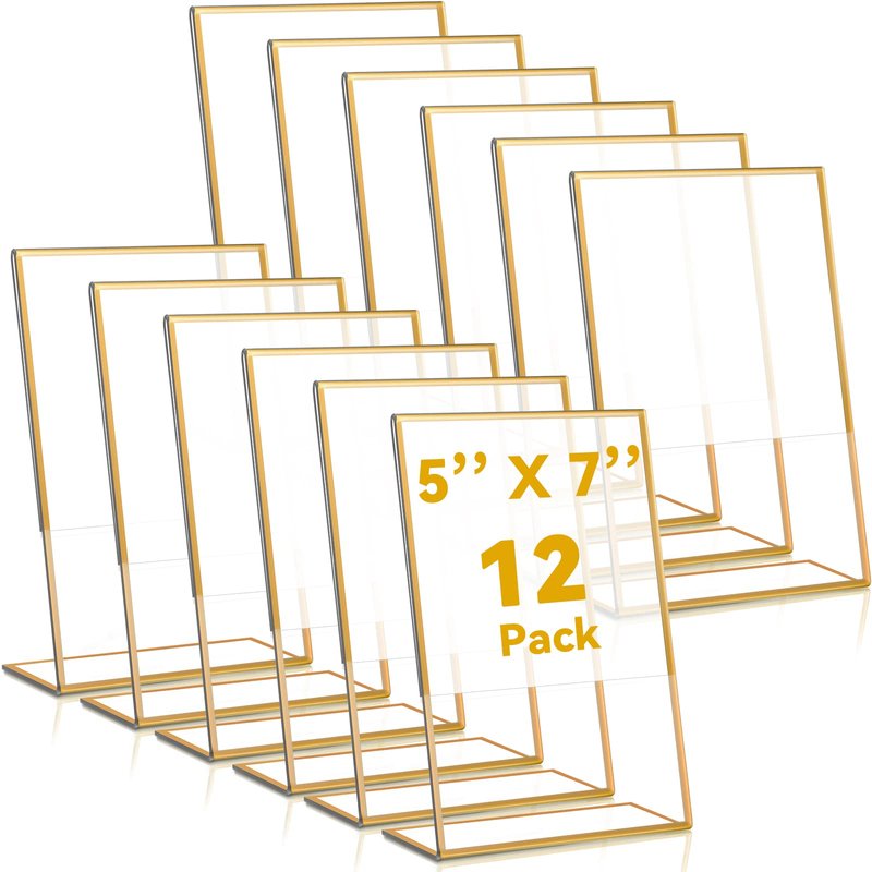 Yulejo 12 Pcs Acrylic Sign Holder Gold Frames Clear Wedding Table Number Frames Menu Holders Double Sided Table Display Stand Slanted Back Picture Frames for Wedding(4 x 6 Inch)