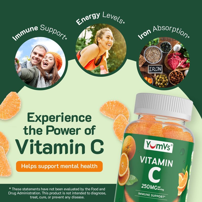 - 250 MG VITAMIN C GUMMIES - Each serving of YumVs Vitamin C 250 mg gummies provides 278% of the recommended daily amount. This high potency Vitamin C 250mg gummy provides support for your immune system and overall health in a delicious, easy-to-take form.