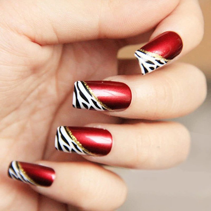 - 【Irresistible French Style】YUNAI French Ellipse Red Wine Oblique Leopard Fake Nails---Classic red with zebra print French style, has a luxurious feeling that you can't resist. Medium length, ellipse, glossy finish press-on nails. This nail is perfect for friends gatherings, weddings, Christmas, New Years and Valentine's Day etc.