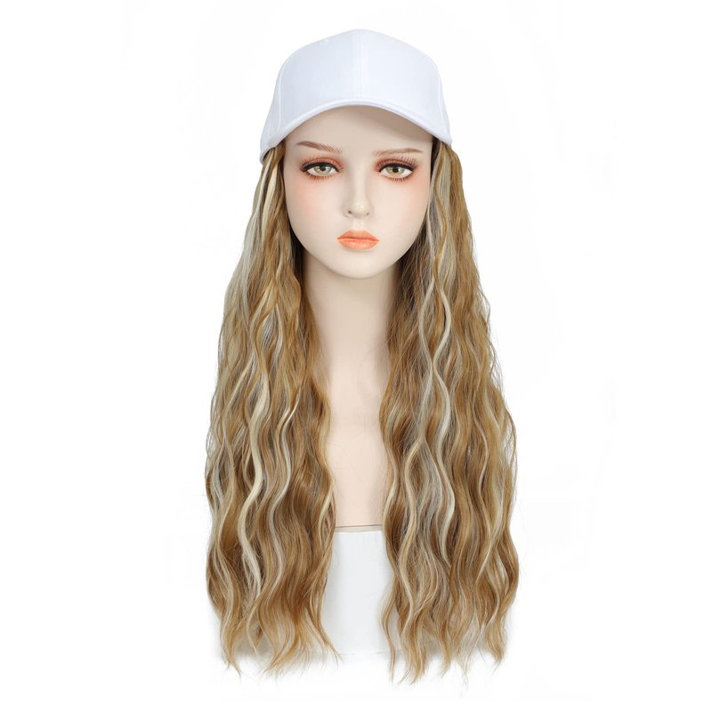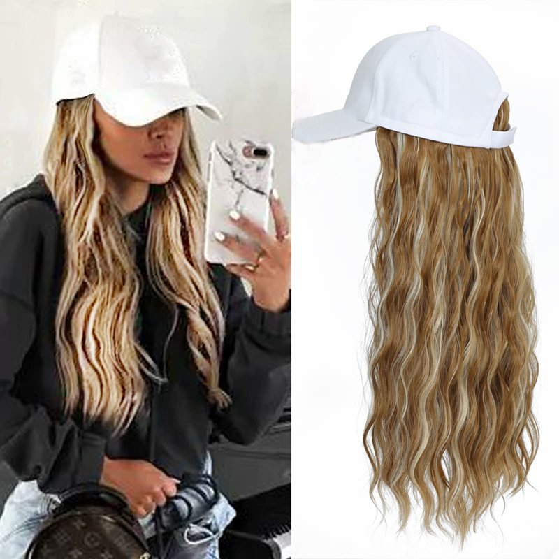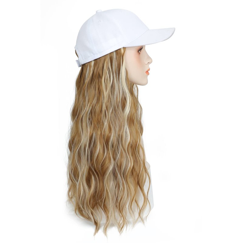 Yunkang Baseball Cap Wig Long Natural Wavy Hair Extensions With White Hat Heat Resistant Synthetic Fiber Hairpieces Adjustable Wig for Women Girls (W-M Blonde honey blonde)